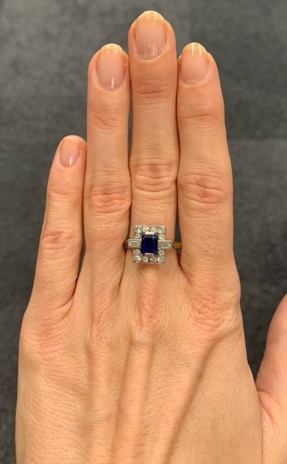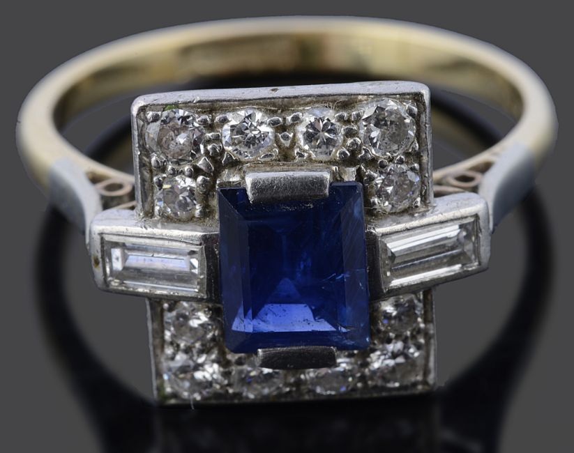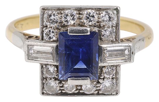 An attractive Art Deco style rectangular sapphire and diamond-set ring