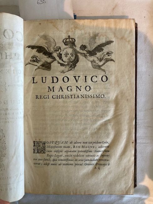 Paris, Daniel Horthemels, 1687, four parts in one volume, one engraved folding plate depicting Confucius, engraved map to rear, numerous tables, genealogies and chronologies to the rear, 1914 bookplate to the von der Gabelentz family, hand-written name of one of the von der Gabelentz family, folio, full mottled calf binding, gilt tooled board edges, richly gilt tooled spine with impressed gilt title and six raised bands, marbled edges and endpapers, pp. cxxiv, 108, 21, 159, xx, 20, 8, 23-108,