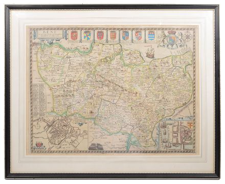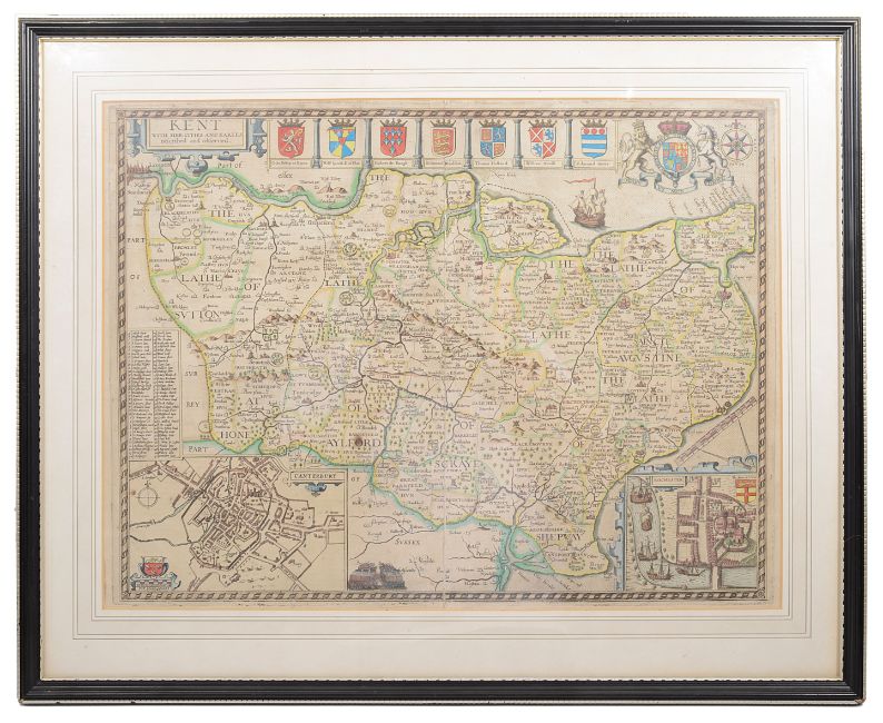 a hand-coloured 17th century engraved map, c.1614-16, inset town plans of Canterbury and Rochester, text verso, mounted framed