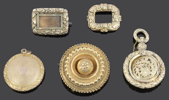 comprising Victorian circular brooch with bead and thread decoration, front tests gold, a Georgian circular locket, tests gold, a Georgian vinaigrette, tests gold, a Georgian memorial hair locket brooch and a part Georgian buckle brooch (5)