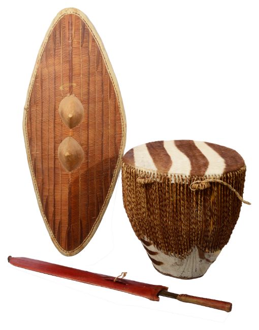 An early 20th century East African Ganda tribal woven rattan shield, an East African Maasai sword and a zebra hide drum