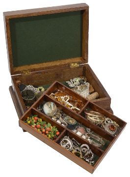 the silver strap buckle bangle with engine turned decoration, marked for Chester and C.H. for Charles Horner together with a Victorian and other bangles, various Victorian and later white metal brooches, some testing silver, silver and marcasite dress clip, silver locket and other pendants, Victorian dress jewellery, art deco glass fruit salad necklace, Venetain wedding cake bead necklace, Neiger Bros. scarab bead necklace, other Art Deco items, a mixed and varied lot contained in an oak two tier jewel box circa 1925 (qty)