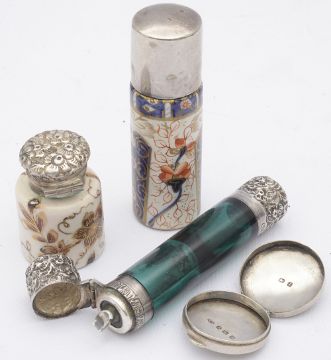 the first double ended teal glass bottle hallmarked on the lid Birmingham 1893, with foliate embossed mounts, second having cylindrical porcelain body decorated in imari palette, the third, unmarked mount, the porcelain body decorated with a bird and foliage, heightened in gilt, together with a silver circular rouge pot with chased decoration to the lid (4)