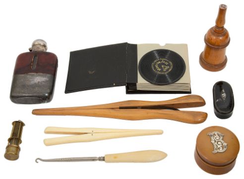 together with a pair of ivory glove stretchers, another larger pair of wooden glove stretchers, a leather covered glass hip flask with pewter cup, a black lacquered papier mache snuff box , a novelty gilt brass Davy lamp cigarette lighter, a 1930s novelty set of eight miniature 78 record drinks coasters contained in an album etc., (qty)