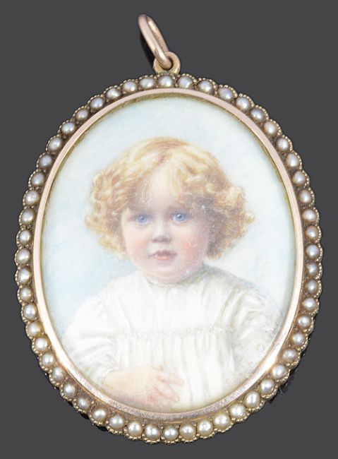 Edith Oliver, Edwardian portrait miniature of a child in gold and pearl set pendant locket
