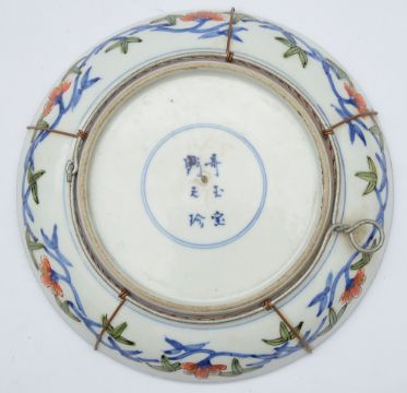 decorated with central reserve containing two birds, an outer border containing orbs and lion-dogs, six character mark and two concentric rings to base