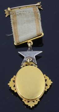 Victorian gold and carved hardstone medal on ribbon, enamel detail, original ribbon
