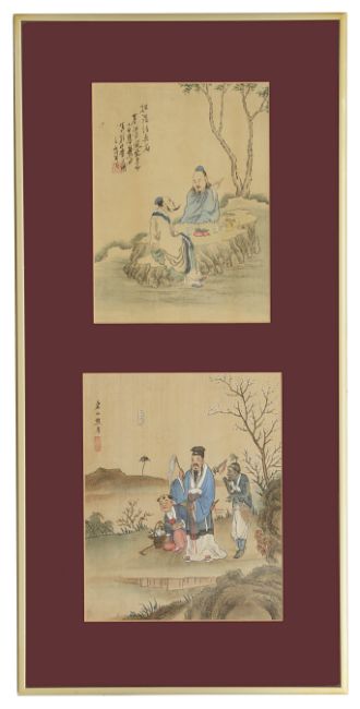 Two paintings, ink and colour, mounted together, comprising two deities sitting at a tree stump table with peach and tea together with three scholarly figures in a landscape, framed and mounted,