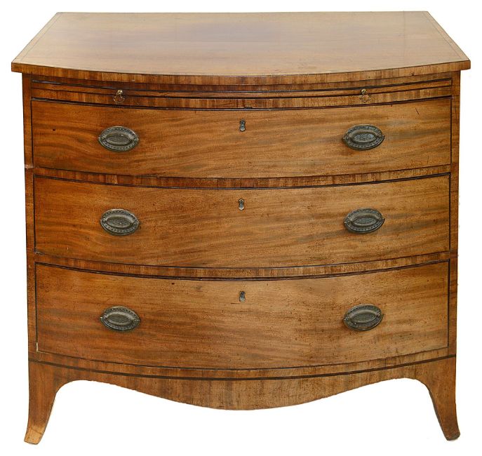 cross banded and ebony strung inlay to top, with brushing slide above three long drawers, embossed oval handles, on splayed bracket feet,