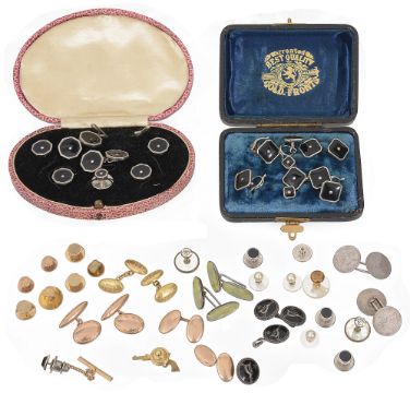 including a pair of small engraved 18ct gold cufflinks, a pair of 9ct cufflinks, eight various yellow metal studs, tests gold, two sets of black Art Deco cased cufflinks and studs, another similar Art deco stud and cufflink set, together with a selection of various silver and other studs and cufflinks (qty)