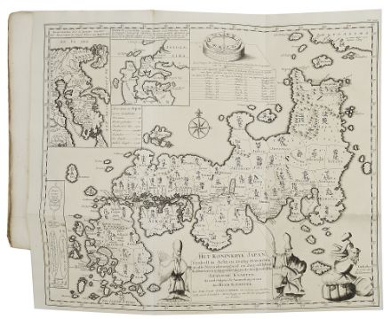 Amsterdam, 1729, first Dutch edition, half title, b&w engraved frontis, printed title in black and red, 48 plates, many folding including full map of Japan,folio, marbled wrappers, pp. 500,