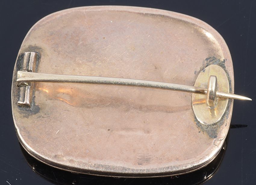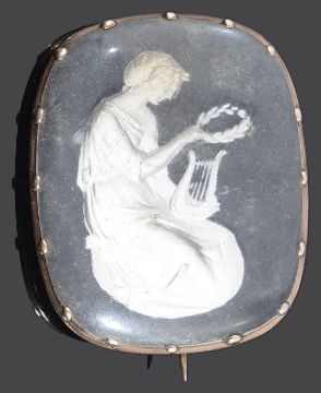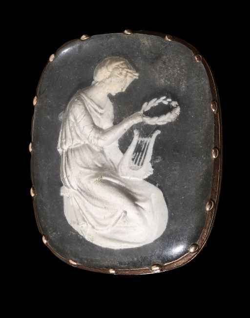 depicting a kneeling classical Greek woman in robes, holding a laurel leaf and a lyre, brooch mount tests for gold
