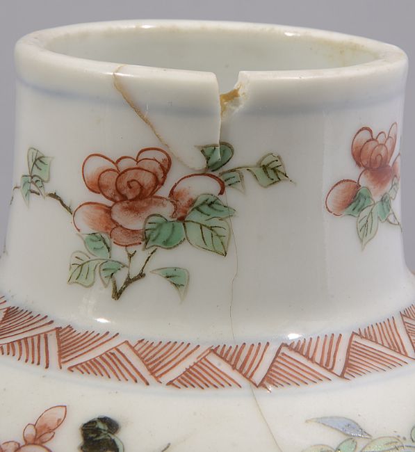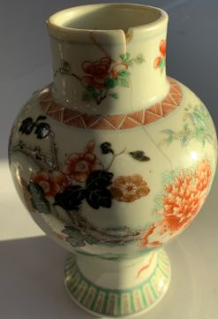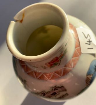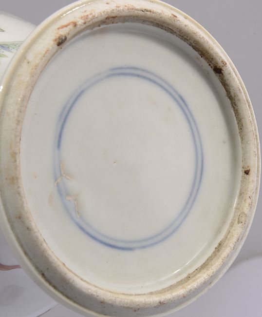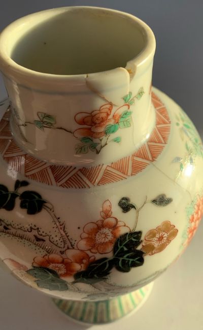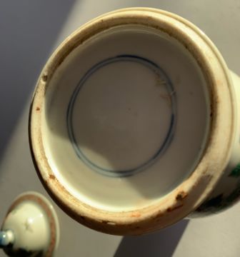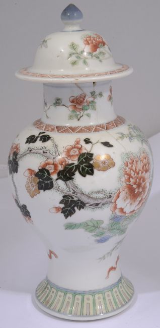 Condition: Small chip to foot of cover. Small fleabite to rim edge of cover. Hairline to vase running down neck and body 7cm length, small loss to rim with small glued chip 1.5cm in width approximately.