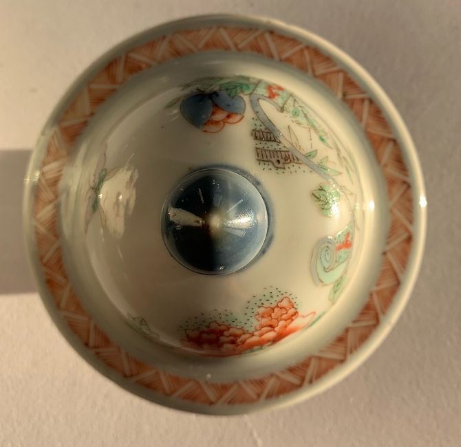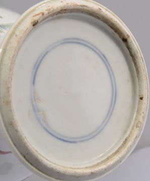 Decorated with a scroll painted with birds, amidst precious objects, flowering prunus branches and peony, geometric pattern borders, double ring mark to base