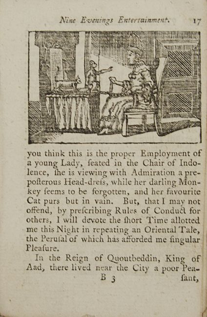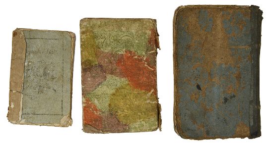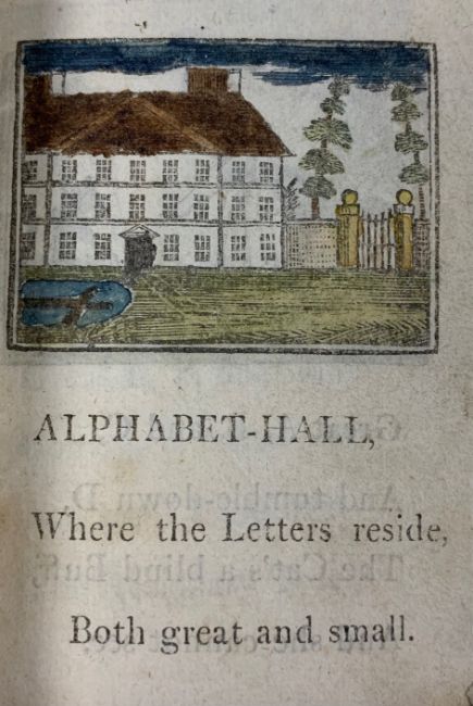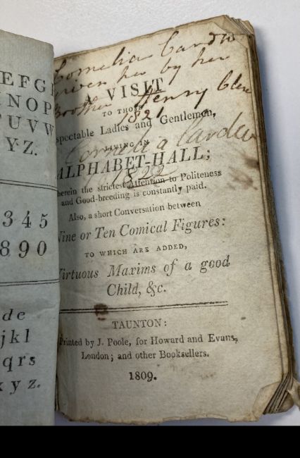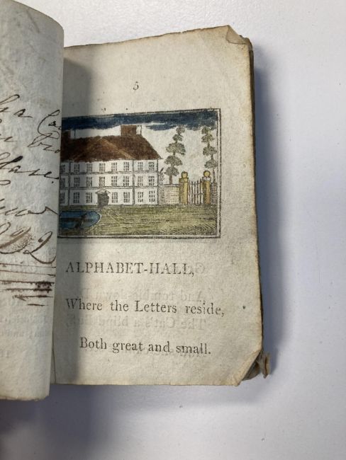 The Little Female Orators; or Nine Evenings Entertainment. printed for T Carnan, 65 St Pauls Churchyard, 1773, 2nd edition, twelve woodcut illustration, original patterned boards, small 32mo., pp. 106. together with a pamphlet, A VISIT To Those Respectable Ladies and Gentlemen, Living in ALPHABET-HALL; wherein the strictest Attention to Politeness and Good-breeding is constantly paid. Also, a Short Conversation between Nine or Ten Comical Figures: to which are added Virtuous Maxims of a good Child, & C., Taunton, printed by J. Poole, 1809, illustrated with 15 woodcuts some with colouring, original printed blue wrappers, large 64 mo., pp. 31 and The Ladder to Learning. A Select Collection of FABLES consisting of Words of ONE, TWO, AND THREE SYLLABLES; WITH ORIGINAL MORALS. ornamented with a great Variety of Engravings on WOOD. London printed for J. Harris, 1810 new edition, half blue morroco with blue card boards, 32 mo., pp 223, pen inscription 'Edward Cardew bought with his own money saved, 1811' and other owners inscriptions (3)
