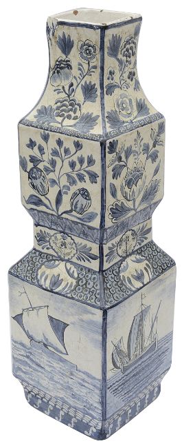 of waisted tapering square section design, painted with panels of sailing ships and flowers, pseudo Chinese four character mark to base