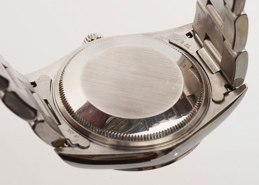 Ref 14000, the blued dial with luminous filled baton numerals and Arabic quarters, stainless steel bracelet numbered 78350 19, with Rolex box and outer card box