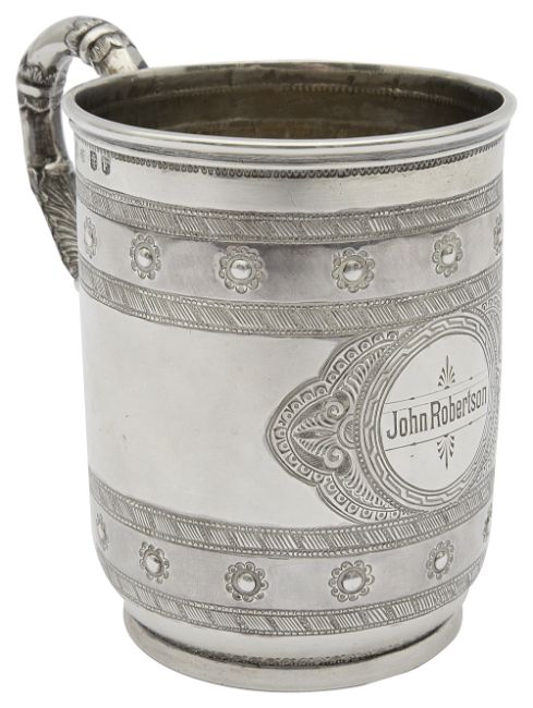 Glasgow, 1876, possibly by James Reid & Co., of cylindrical form on a circular foot, with scrolling handle and decorated with bands of stylised flowers, a central medallion engraved 'John Robertson',