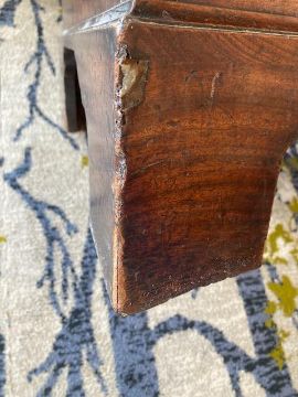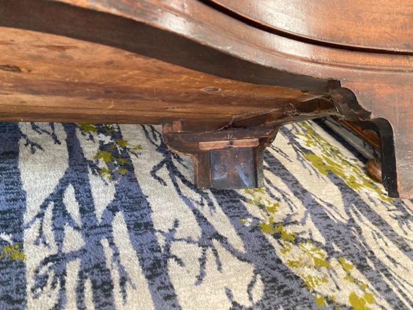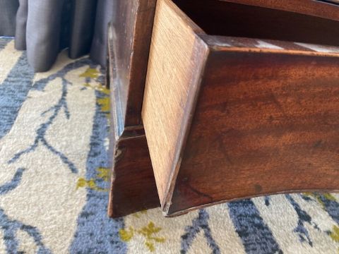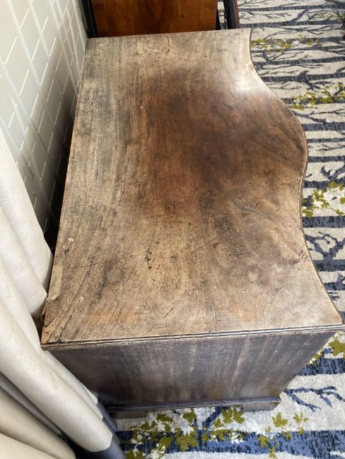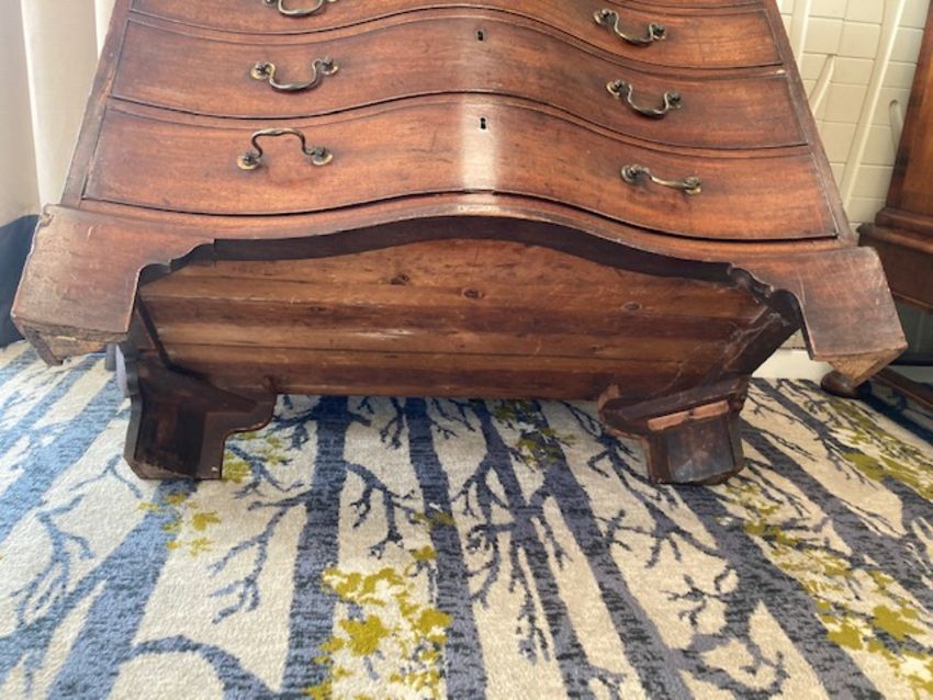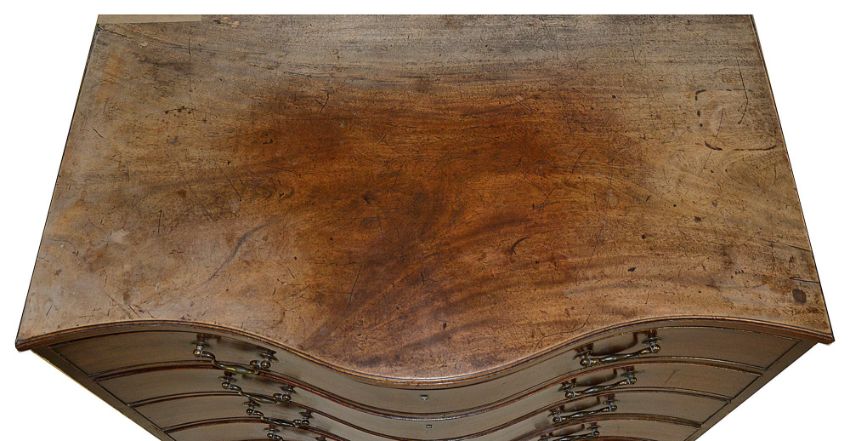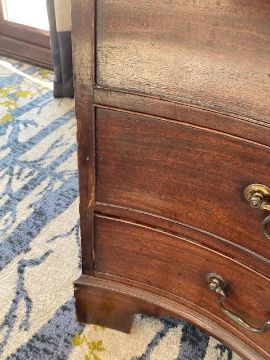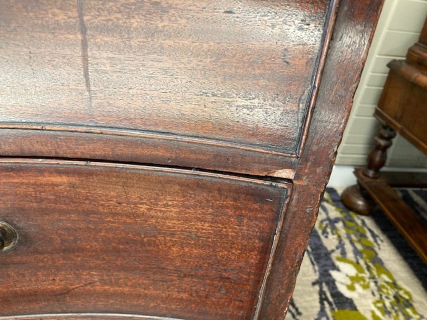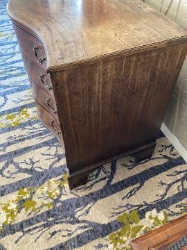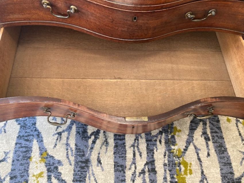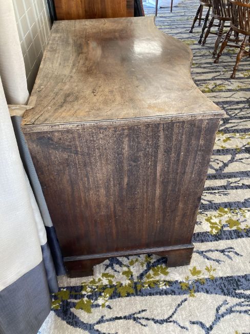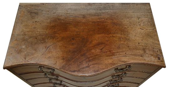 A George III mahogany serpentine fronted chest of drawers, in the manner of Thomas Chippendale, moulded edge top, above four long graduated drawers, with brass drop handles, on bracket feet,height 84cm., depth 56cm., with approx 106cmCondition: Top is sunbleached in a a u shape. centre is darker. The veneer has lifted rear left corner. One large piece is taped down and will lift off but is present. Sides and back have also faded more prominently towards the top Fair colour to front and good figuring.  Some minor loss to cockbeading round drawers. Chips to veneer on corner edegs of bracket foot.  Handles and locks appear to be orignal and undisturbed