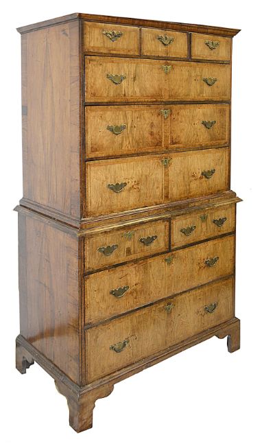 the cornice top above fitted with three cross banded short and three long graduated drawers, the lower section with two short and two long graduated drawers, on bracket feet,