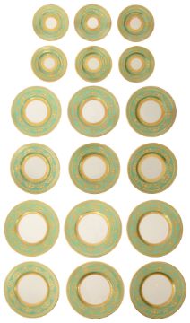 pattern K-246, gilt tooled foliate scroll green borders, printed factory marks, comprising six dinner plates, six dessert plates and six side plates, (18)