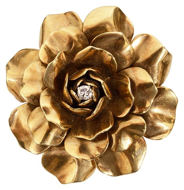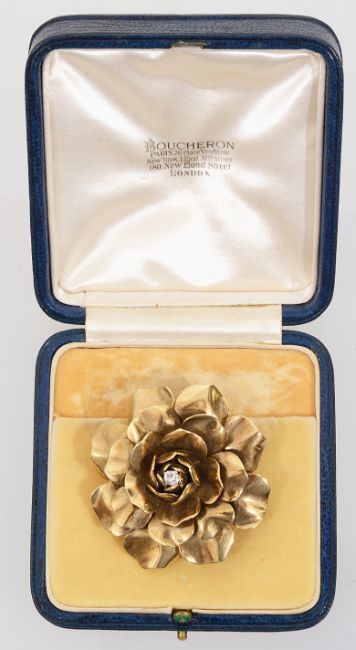 A large diamond-set floral clip brooch by Boucheron, circa 1940the tiered yellow gold petals centrally-set with a brilliant-cut diamond, double hinged pin to reverse, signed ' Boucheron London' to the reverse and personalised inscription 'L.S. 5.5.1944', original blue leather case for Boucheronapprox. 33.3 gm., approx. 5.5 cm at widest pointCondition: Small loss to one of pin hooks. Otherwise in good conditionDiamond spreads 0.15 - 0.20cts, good colour and clarity