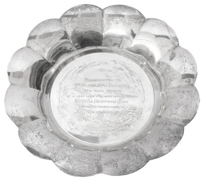 of circular plain form with flared petal shaped rim, on four scroll feet engraved with a presentation inscription