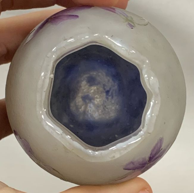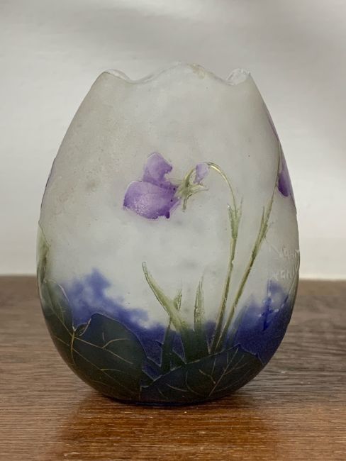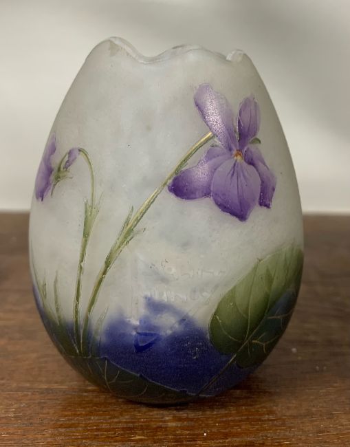 ovoid form with wavy edged rim, delicately painted with violets and foliage against a translucent mottled ground terminating in a blue ground, signed Daum Nancy with the cross of Lorraine