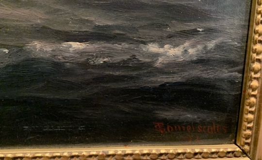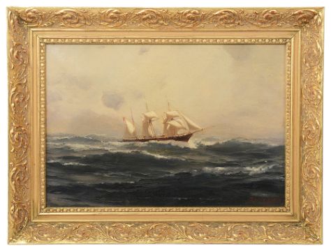 Thomas Jacques Somerscales (British, 1842-1927)'Three masted vessel on open seas', possibly Chilean naval vessel, oil on canvas, signed and dated to lower right T. Somerscales, 92',overall width 43.75cm x 33cm canvas 35cm x 25cm Condition: Overall condition good. In modern frame, stretcher mark scratches visible to lower edge. No restoration visible to vessel/ sky, areas of restoration visible within in the sea, visible under UV/ with naked eye (see condition photographs).From a Private Collection. Thomas Jacques Somerscales (1842-1927) was a Yorkshire born painter particularly known for his work as a Marine Artist. Somerscales served with the Royal Navy from 1863 until 1874. Upon being invalided ashore in Chile, 1874. He settled there and began a career as a professional artist. Somerscales lived and worked in Chile from 1874 until 1892, where he painted many scenes of the Chilean navy.