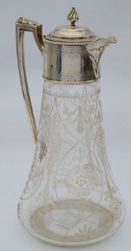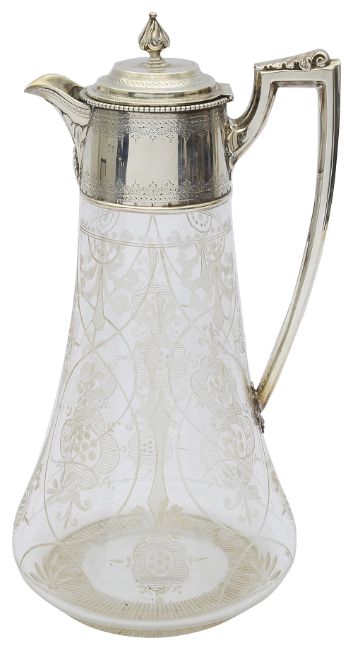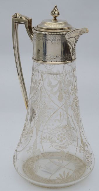 the mount London, 1871, makers mark for Elkington & Co., the mount with an angular handle surmounted by an acanthus leaf, hinged lid topped with finial, a punched decorative motif, the glass of tapered form etched with stylised floral decoration