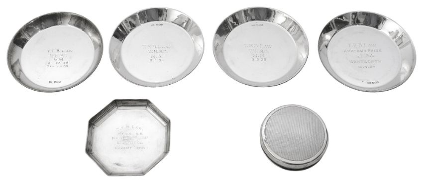 of which one is octagonal, London 1936 by H Philips, the others circular, together with an engine turned jar lid, (6)