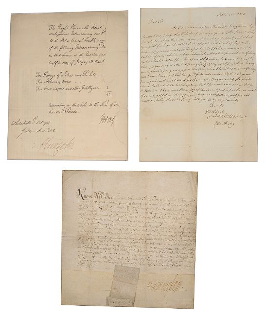 Historical Manuscripts Documents: A collection of ten 17th century and later letters, from historically important figures, including; George Villiers, Second Duke of Buckingham (1628-1687), signed letter date 1661; William Stanhope Harrington, 1st Earl of, signed letter relating to a payment for Horatio Walpole (Horace Walpole); Richard Cobden (1804-1865), two signed letters, dated 1850 and 1859 together with a clipped signature; Richard Corney Grain (1844-1895), a signed letter written; Robert Browning (1812-1889), an inscribed clipped note; Laurence Whistler (1912-2000), signed letter dated 1955, on Little Place, Lyme Regis headed paper; a note addressed to Reverend John Hodgson from the office of Sir Humphrey Davy, regarding a meeting, together with a letter and printed Sonnet entitled 'To My Old Wig', dated 1795 (10),