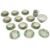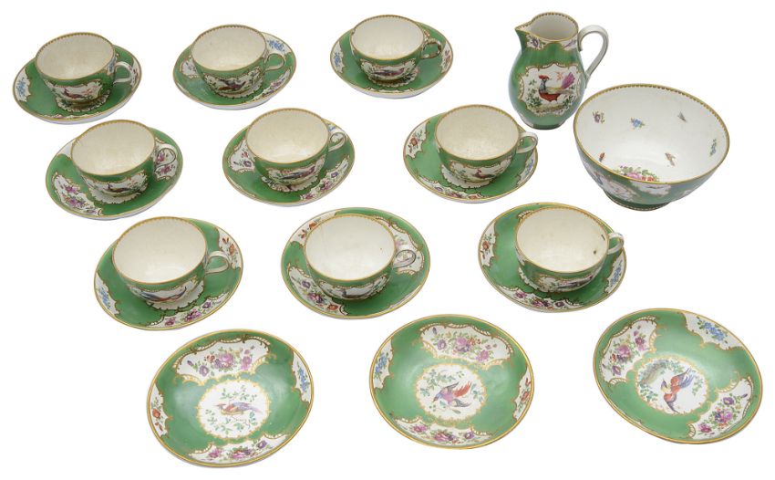 decorated with gilt scroll framed panels containing exotic birds, insects and flowers against a green ground, comprising nine tea cups and twelve saucers, a sugar basin and a milk jug, apple and bees factory mark (qty)