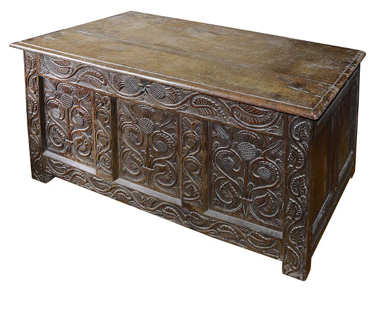 the three panel front carved with thistles and scrolling vine borders, the plain top of later date with moulded edge and interior hinges, raised on four stile legs