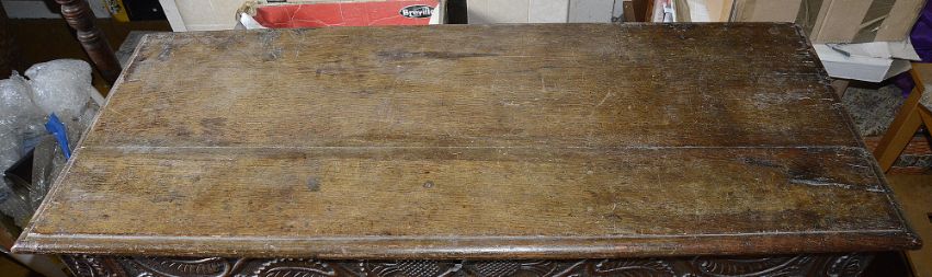 Condition: The coffer is in poor condition commensurate with age with loose broken base requiring some restoration, some scratches, marks and losses to the planks of the top, some shrinkage to the joints, the hinges are also possibly later replacements.