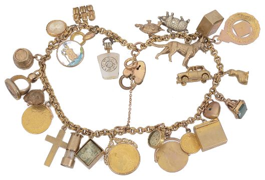 Condition: Please note a few charms are not gold such as pig and Masonic charm. In worn condition.