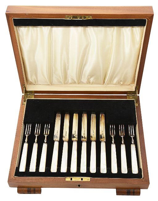 A set of six George V mother of pearl handled fruit knives and forks
