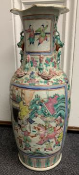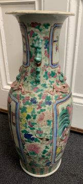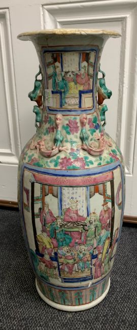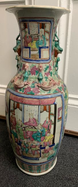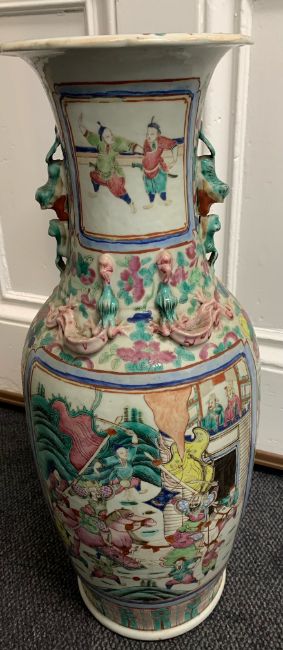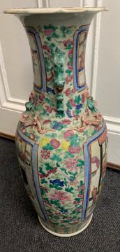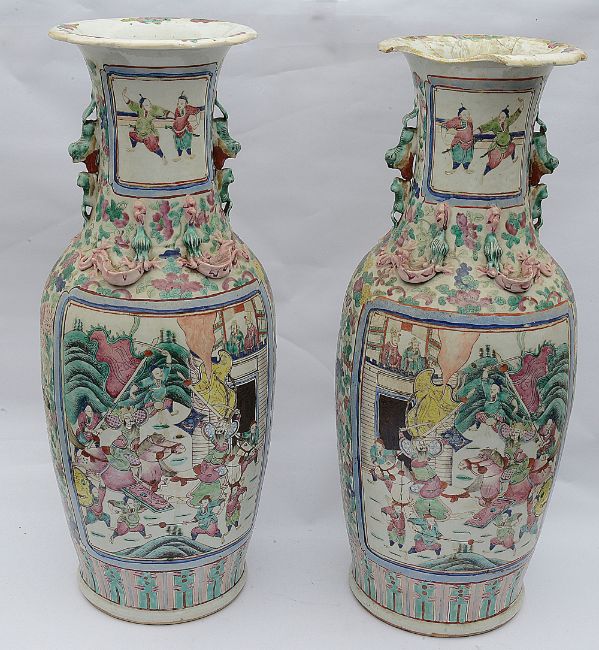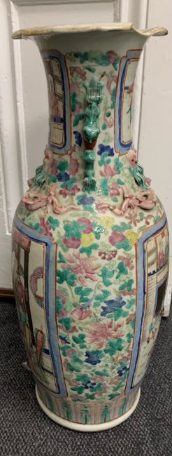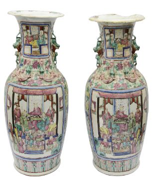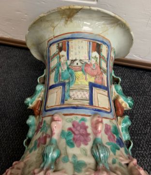 of ovoid form with flared shaped rim, painted with court scenes on a foliate ground, applied with dragons to the shoulders and vase neck, (2)