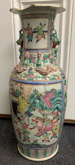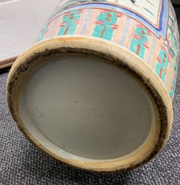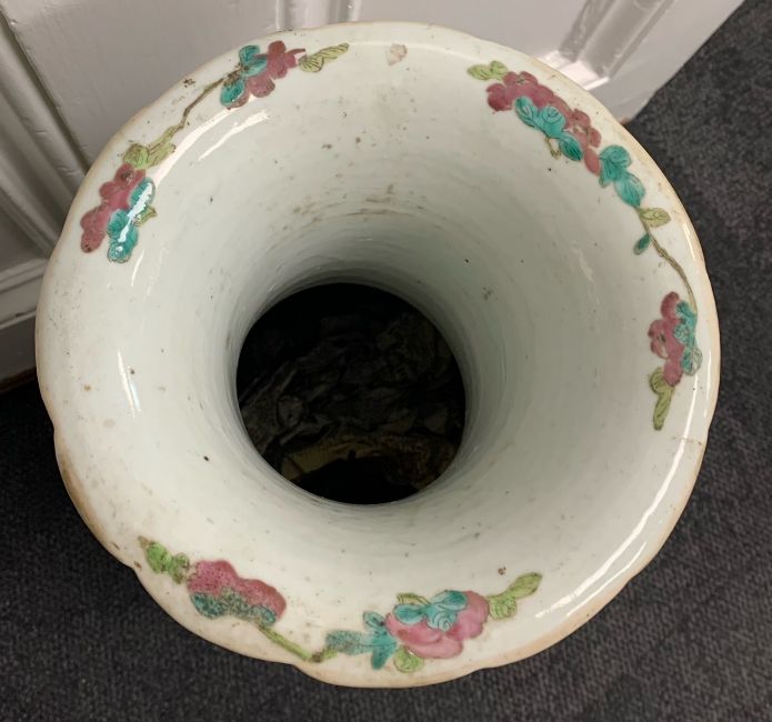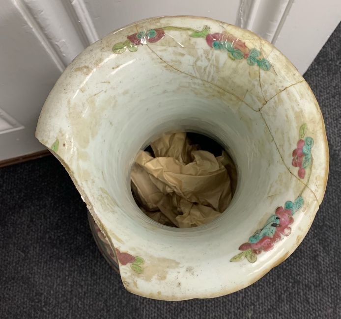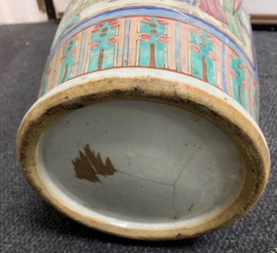 Condition: The first vase is in good condition commensurate with age, with no major cracks, slight chips to base and losses to the vase surface, the second vase has a large loss to the rim and other sections to the rim which are cracked and/or restored, some held on with sticking tape, there are some slight losses to surface and base, both vases are superficially dirty and marked, crack visible to base. Missing section of rim is present with some slight small losses