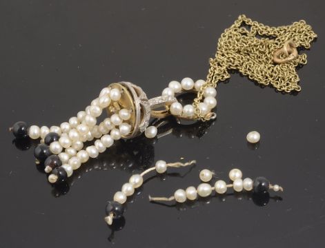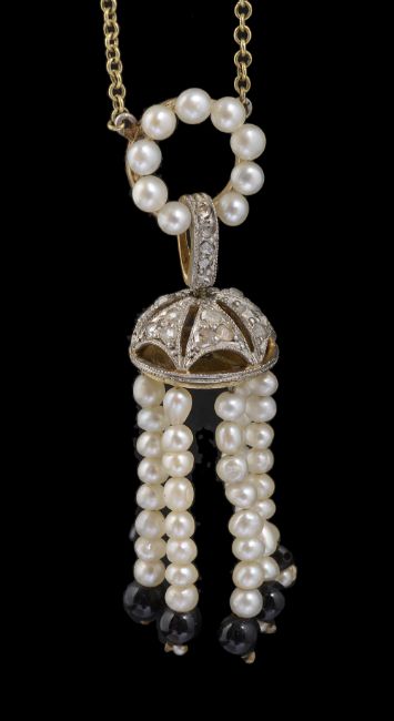 having pierced diamond set dome with small pearl tassel drops terminating in an onyx bead and with rose diamond set bale with pearl set circle above, attached to fine yellow metal chain a.f. tests for gold