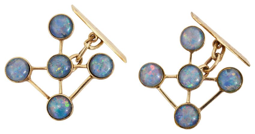 each set with five circular opals in closed setting in a geometric design, chain and bar fitttings, stamped .375 for 9ct gold to reverse