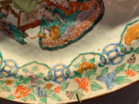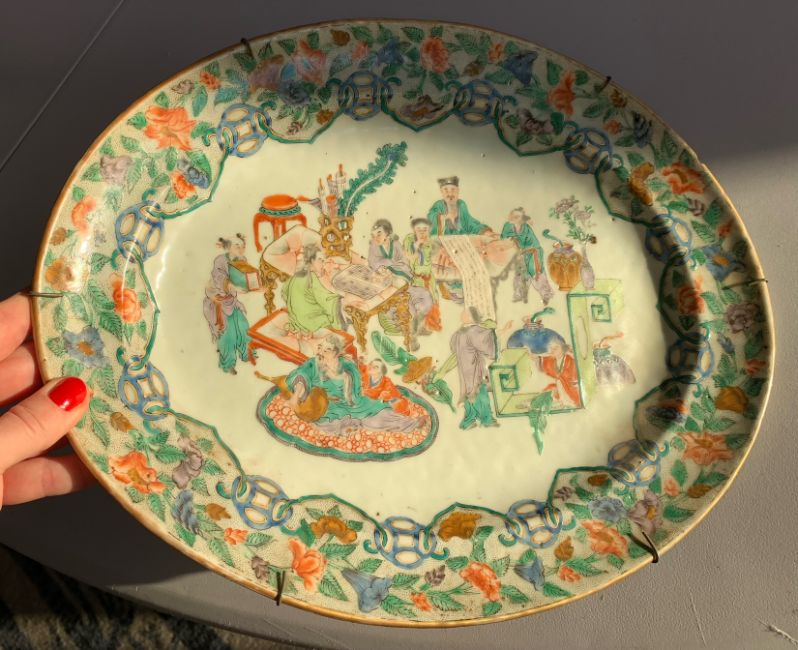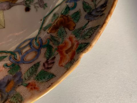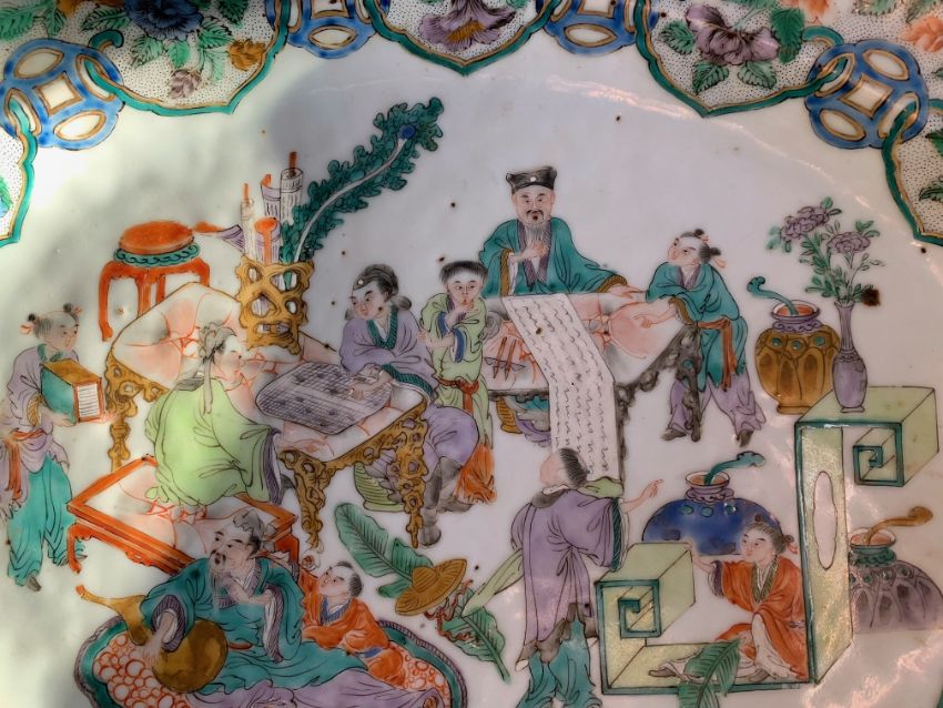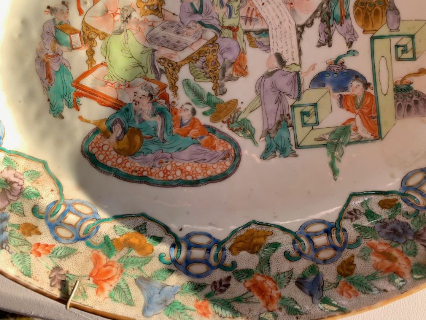 painted to centre with a group of scholars and attendants, some at table reading scrolls and playing chequers, dense floral border, gilt rim