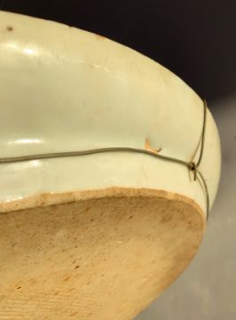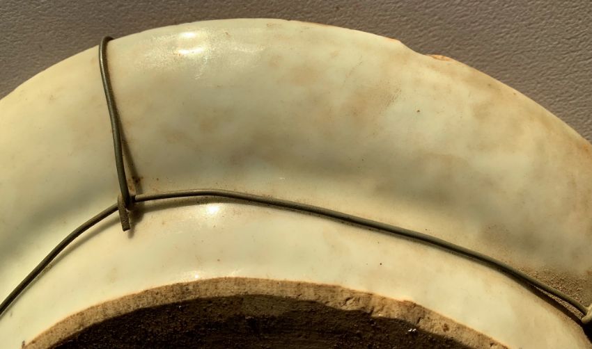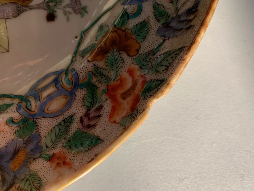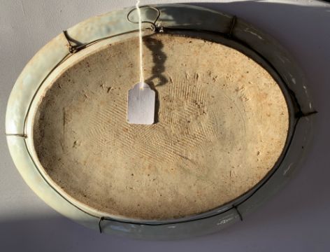 Condition: Slight chip to rim at 2 o'clock, chip 1cm wide, faults to glaze, metal wire for wall hanging. Slight rubbing to gilt