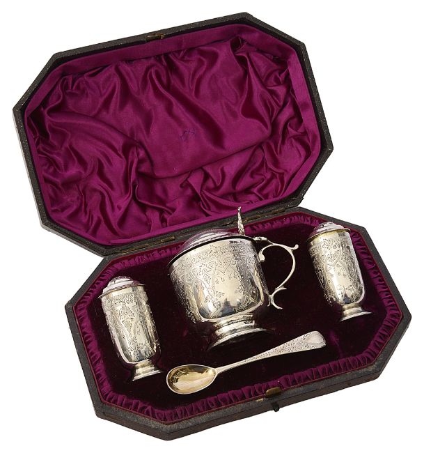 with bright cut decoration, comprising mustard pot and spoon fitted with a blue glass liner and a pair of pepperettes, in magenta velvet and silk lined fitted leather case,