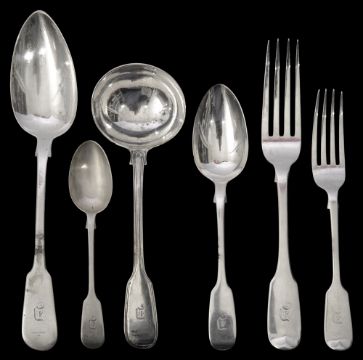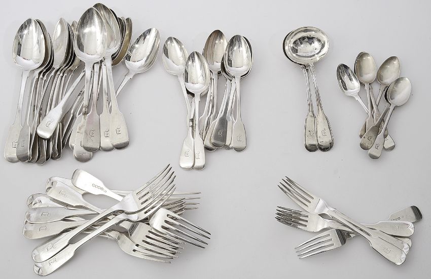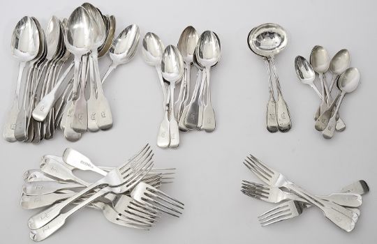 comprising nineteen tablespoons of which twelve, London, 1824, by Charles Boyton, ten dinner forks, of which six London, 1828 by Richard Britton, eleven dessert spoons, five dessert forks, seven teaspoons and a pair of fiddle and thread pattern sauce ladles, initialled D, (54)
