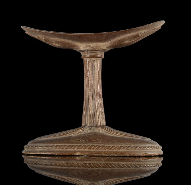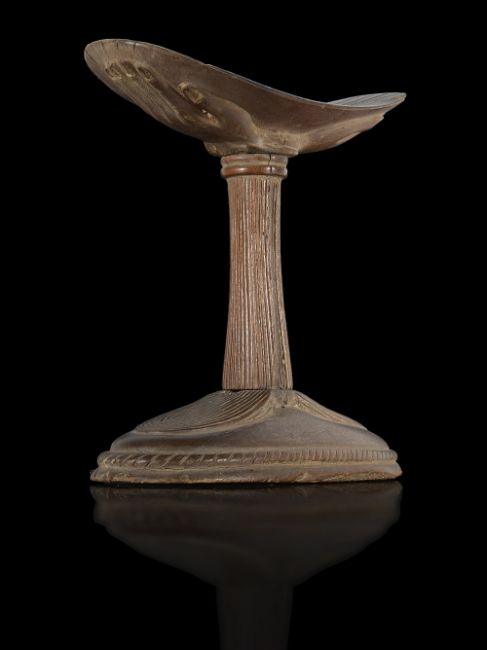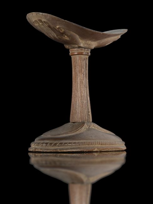 Condition: Slight chips and losses to rest. Wood a little dry and cracks have begun to appear. Slight stain to pillow. Small notch to one side with signs of scorching. Stem has some movement at joints. Small loss at base of stem on base. Hairlines / cracks to base.