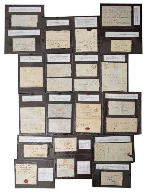 Postal History: A collection of twenty four mid 18th to mid 19th century pre stamp covers, postal marks including; Alford, Andover, Bradford, Chester, Gainsborough, Liverpool, Leeds, Louth, Salisbury, Wiveliscombe, Worcester, (24)