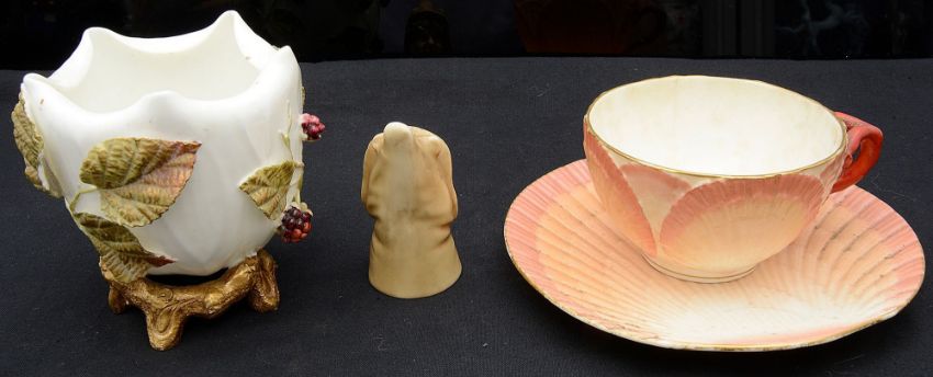comprising a Royal Worcester blush ivory candle snuffer modelled as Mrs Caudler, c.1920, marked to the inside, a Moore Brothers porcelain vase, in the form of a flower with applied leaves and berries, raised on a naturalistic twig base, mark underneath, and a Sarreguemines teacup and saucer, modelled as a shell in a salmon ground, with applied coral handle, marked to base, (3)