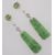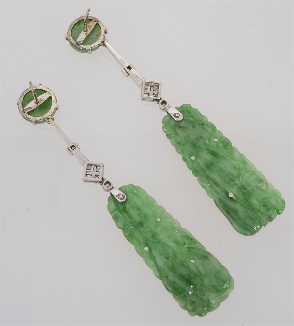 An attractive Art Deco pair of jadeite and diamond-set ear pendants, each designed as a tapering shaped rectangular carved plaque suspended from a tapering white gold bar stamped '18ct' with diamond-set detail to the circular carved jadeite surmount, later fitted caselength 7cm, plaque thickness circa 2mm, combined gross weight 8.8gmCondition:One post back deficient. Earring one has a crack and bubble from the bottom tracing it up, it appears that the jade has been broken and repaired. Earring two appears in fair condition with minor chip to side.