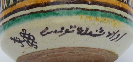 probably Fez, of bellied form, with flared rim, decorated with stylised leaves and signed and possibly dated to lower edge
